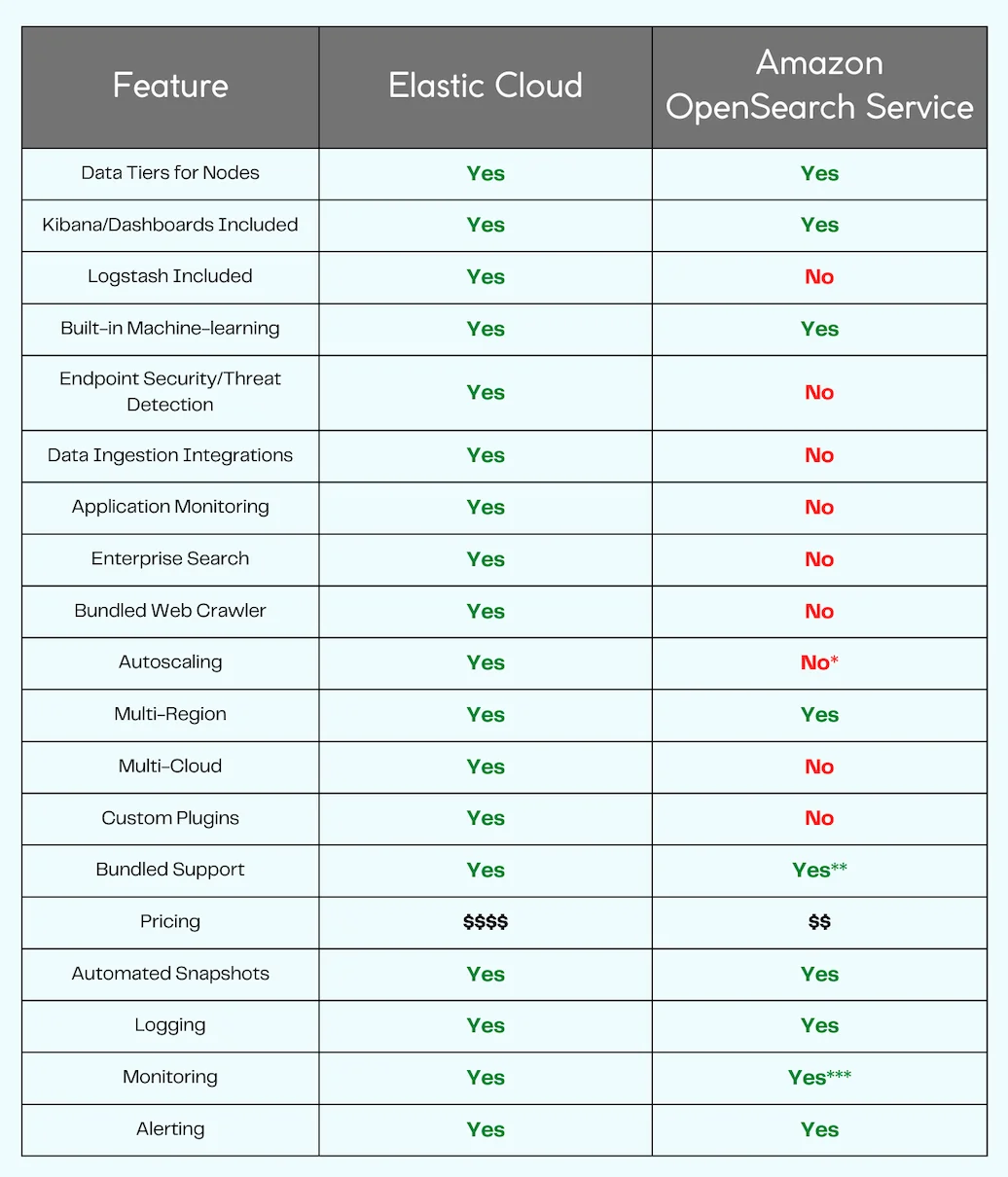 Can you notice a pattern in the table above? Elastic Cloud clearly offers a lot of additional software solutions and proprietary features. There is a lot more bundled together in one seamless package (note that some features are only available to the higher end licenses). OpenSearch, while still fully-featured as a search solution, does not bundle nearly as many additional features. In some cases this is a good thing. Why pay for these additional features when all you need is basic search engine functionality? OpenSearch tends to be a lot more cost-effective because of this less-is-more approach. It can be much more suitable for a logs/metrics use-case while Elastic Cloud can be a better platform for more elaborate, advanced use-cases.