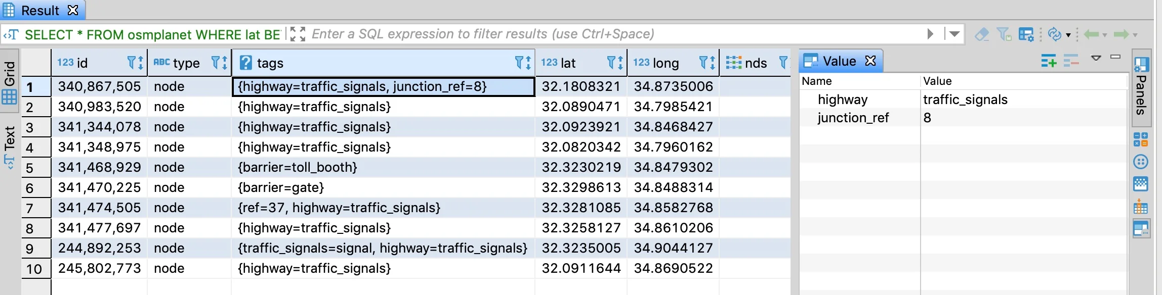 LIMIT 10;From the results, we can understand the basic structure of the data: each row is an entity on the map (a node, or a building, for instance), with latitude and longitude to determine its location, and further information stored in a map of tags. Since we (most likely) got results with an empty map of tags, what we want is to get results that have actual data in that field.