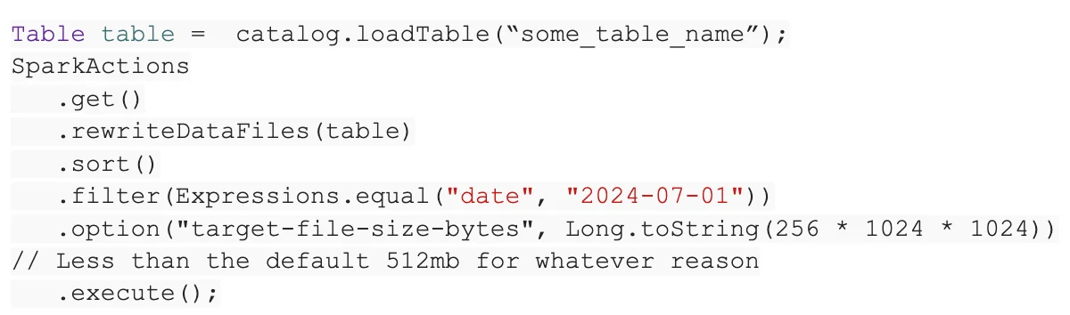 You might not want to conduct compaction on the whole table, especially if you pick the binPack method. To prevent tiny files, consider compacting only the data produced most recently. You can do that by filtering your table by its partitions.