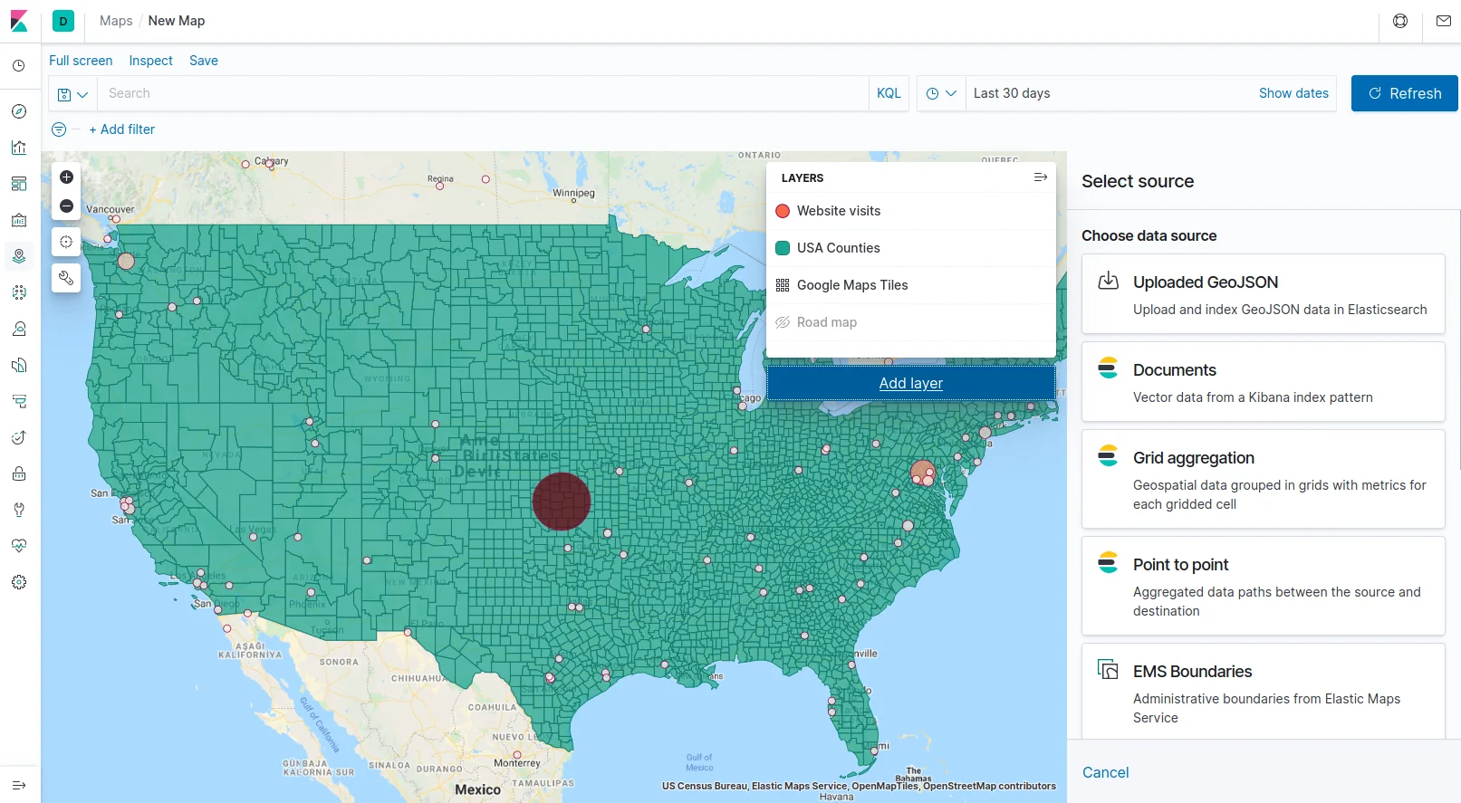 We found it very useful to create “views” in Elasticsearch just as before, but this time our purpose is to leverage Kibana’s Maps app to visually and interactively browse the geo-spatial data in real-time. This proved to be a rather neat approach when the data and the queries are really geo-spatial oriented.