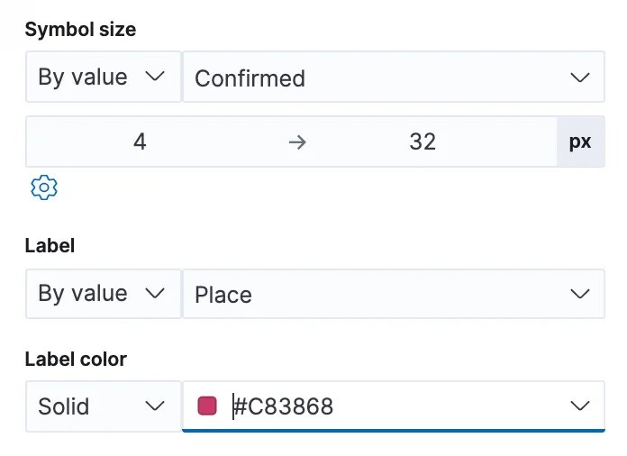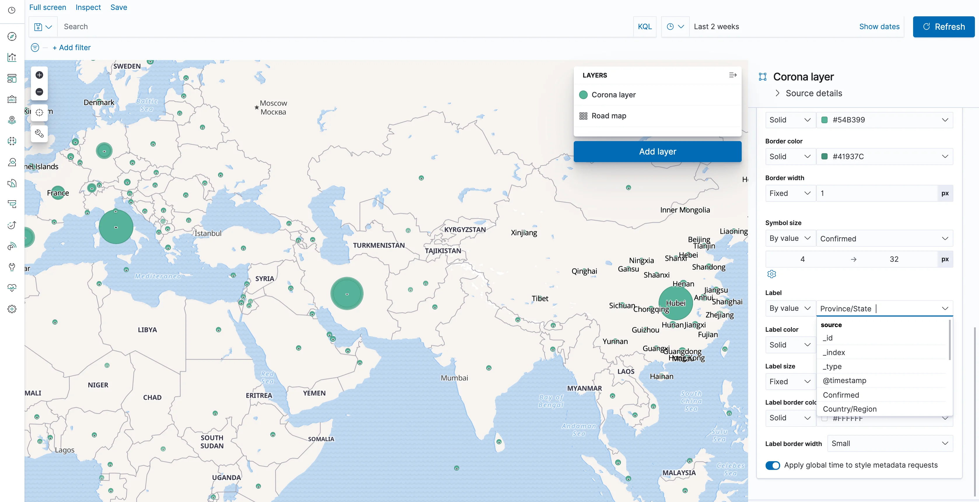 Once you can see the Location field in the maps app, click "Add layer". Set the time filter to show data from the period that had been loaded, and you'll now be able to see stats on the map. Unfortunately, they're not the right stats yet - and - as you may have guessed now that you've created some visualization already - they're the document counts. So let's change the layer settings to fix that. That's achievable by scrolling down in the layer settings, and changing the symbol size from Fixed to "By value", and choosing the "Confirmed" metric.