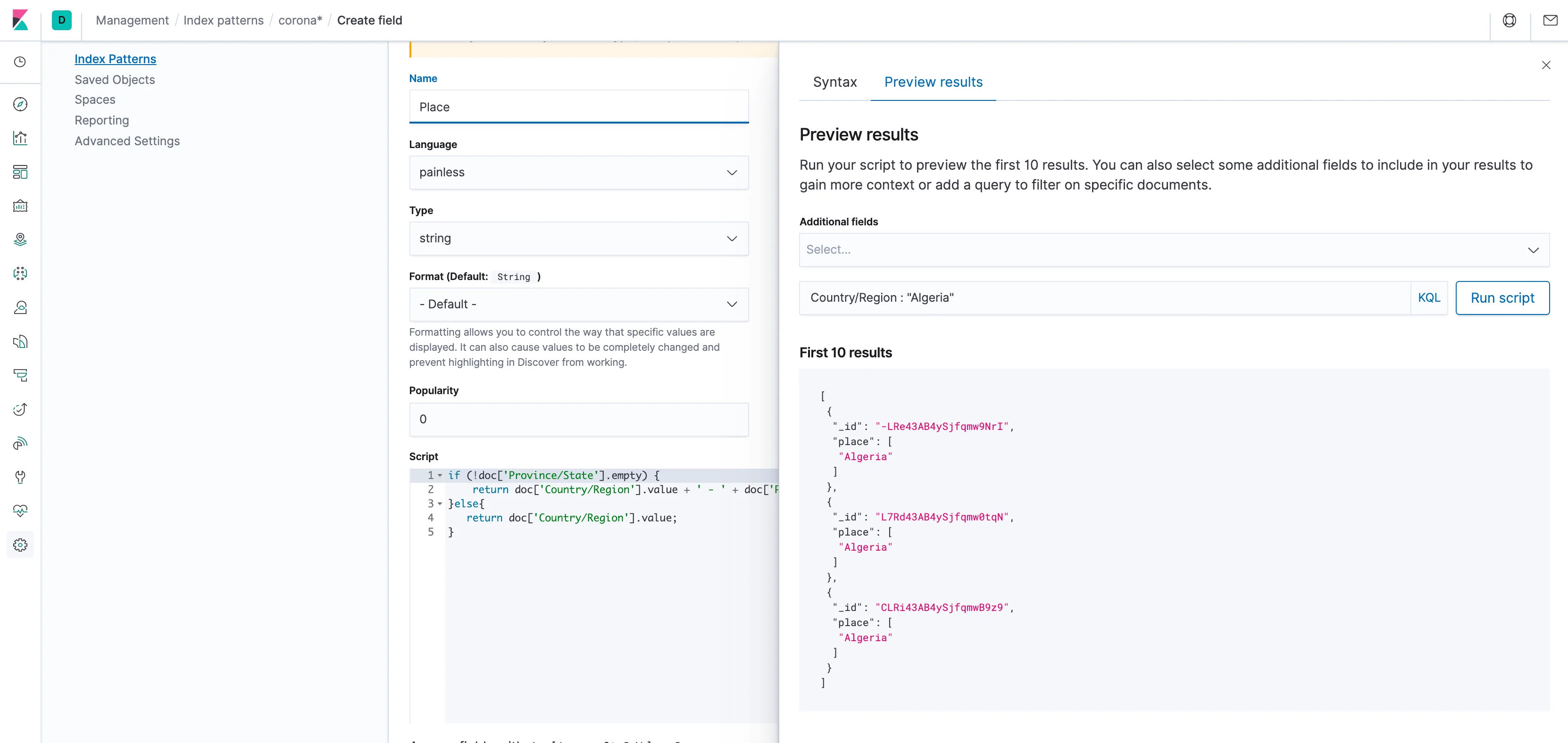 So optimally we would pre-bake a calculated field to solve such an issue during data ingestion, like we did with the Location field. But rather than having you go through deleting the indices again and loading the data, this time we'll add the field in the index pattern. This is done using a script, which means it's usually not recommended performance-wise, but sometimes we don't want to reload the dataset and are willing to pay the price of the on-the-fly calculation. So save the layer and then save the map, and then let's go into the index pattern to add the field. This is done using the Kibana management app under Index Patterns. Now go to the index pattern corona*, and choose the Scripted Fields tab. Add a scripted field, call it "Place", choose Painless as Language, and string as type, and then insert the following into the script box: