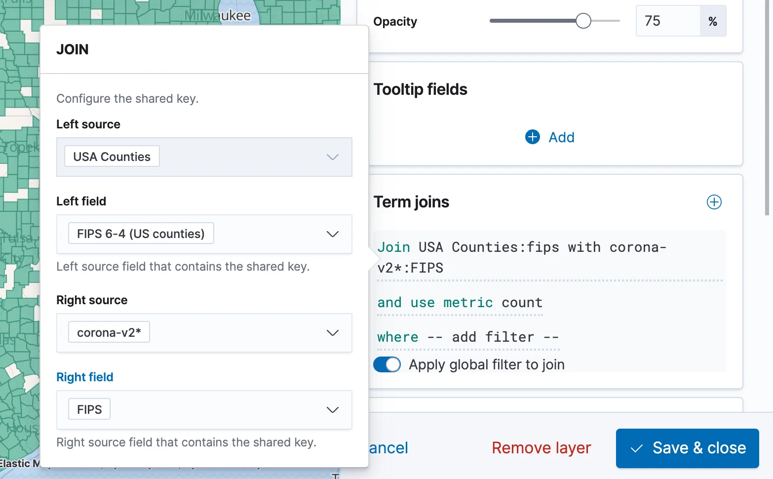 Back to the "Edit layer" panel in our map, click on the plus sign near "Term Joins" and choose "FIPS 6-4 (US counties)" as the Left field. Under Right source, choose corona-v2*, and under Right field choose FIPS.