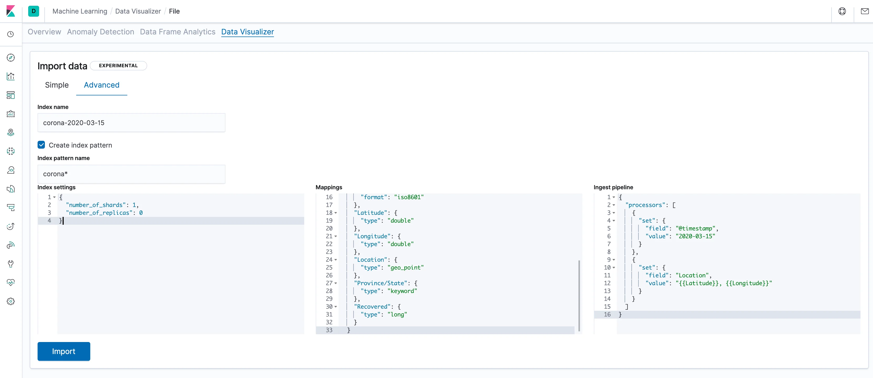 "Index name" is where you want the data to be loaded. Optimally Elasticsearch indices can be pretty large and probably all of the data for the purposes of this example can use one index. However the upload interface doesn't allow to upload several files into one index. Instead, we'll create several indices with a certain naming convention, and view all of them by using the index pattern. One conventional naming pattern would be corona-YYYY-MM-DD, so let's use that - if we've used the file