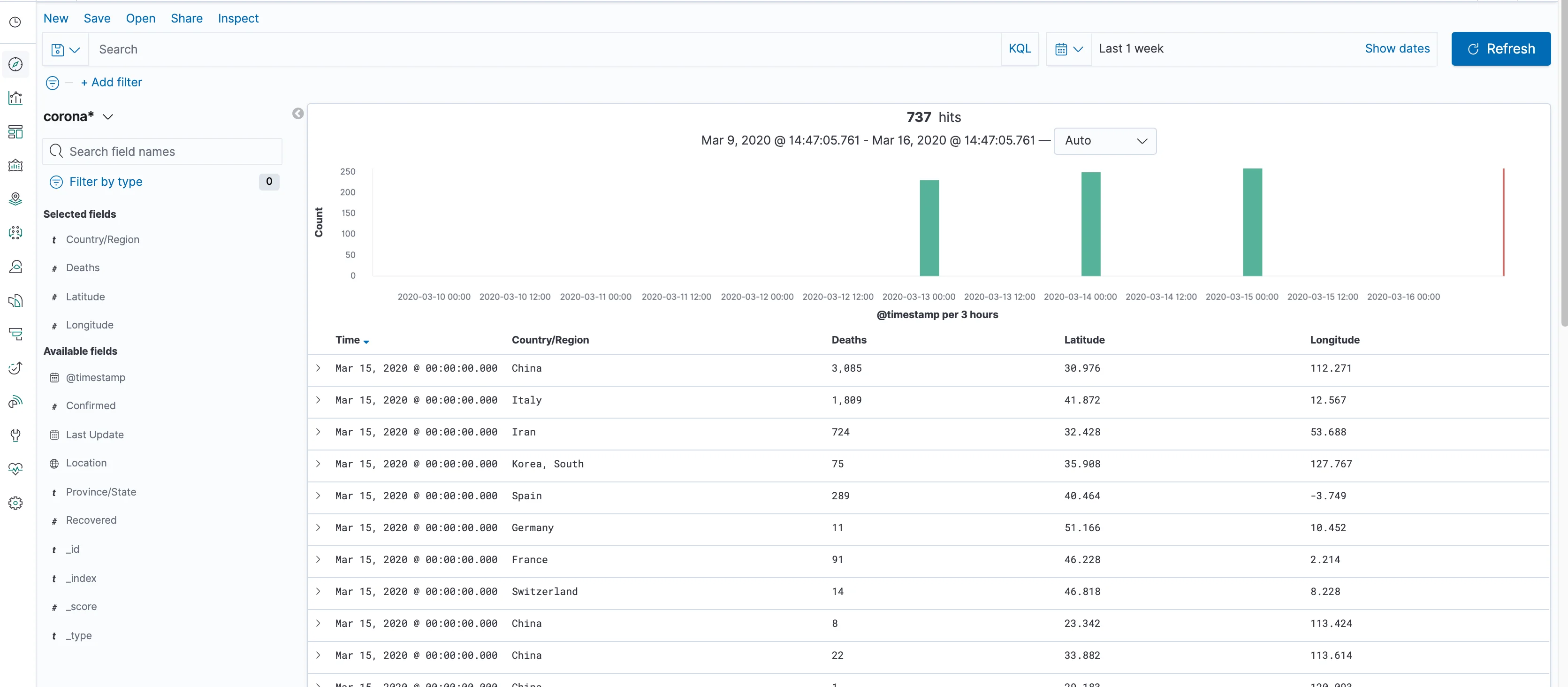 The chart shows the document count for each day, which is essentially the number of reports from different places per day (as Elasticsearch has a document store, a "record" from the file becomes a"document" in Elasticsearch). While the count is not a meaningful statistic, this immediately helps you see which days fall into the filter period.