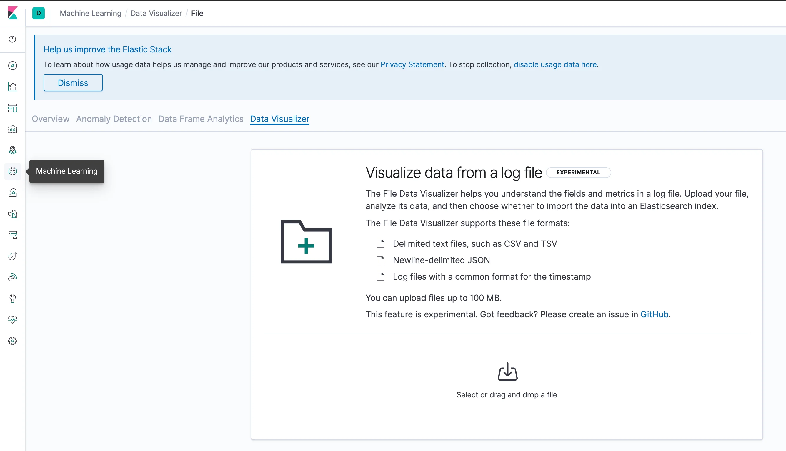 In order to load the file into Elasticsearch, go to Kibana's Machine Learning application, and under "Import Data" choose "Upload File". Go ahead and choose one of the files you've downloaded.