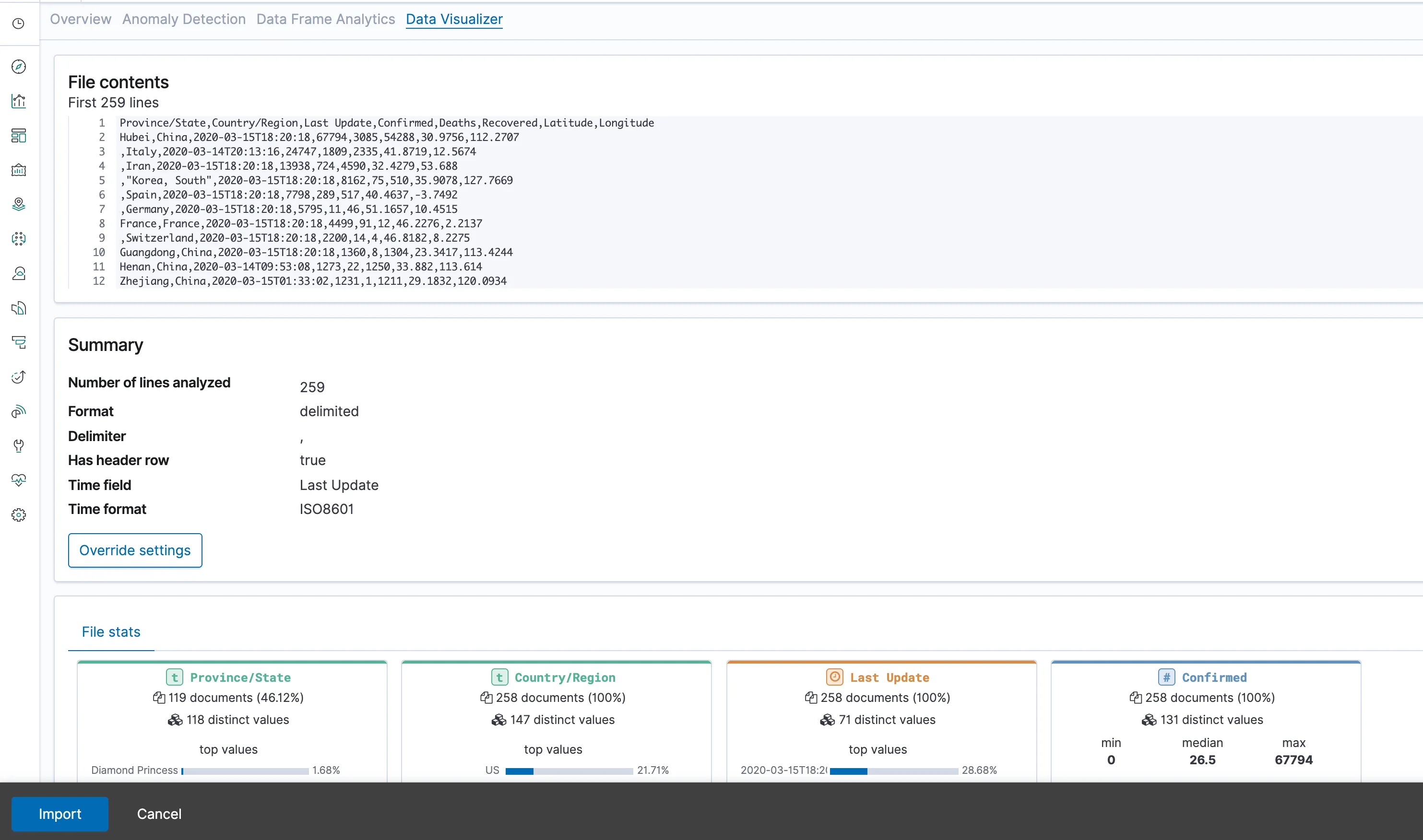 Click Import and the data will be imported. Below you'll get options to view the data in the data visualizer, which is similar to the preview from before, only with a bit more visualizations. After that, feel free to click the Data Visualizer tab at the top of the screen again and import additional files.