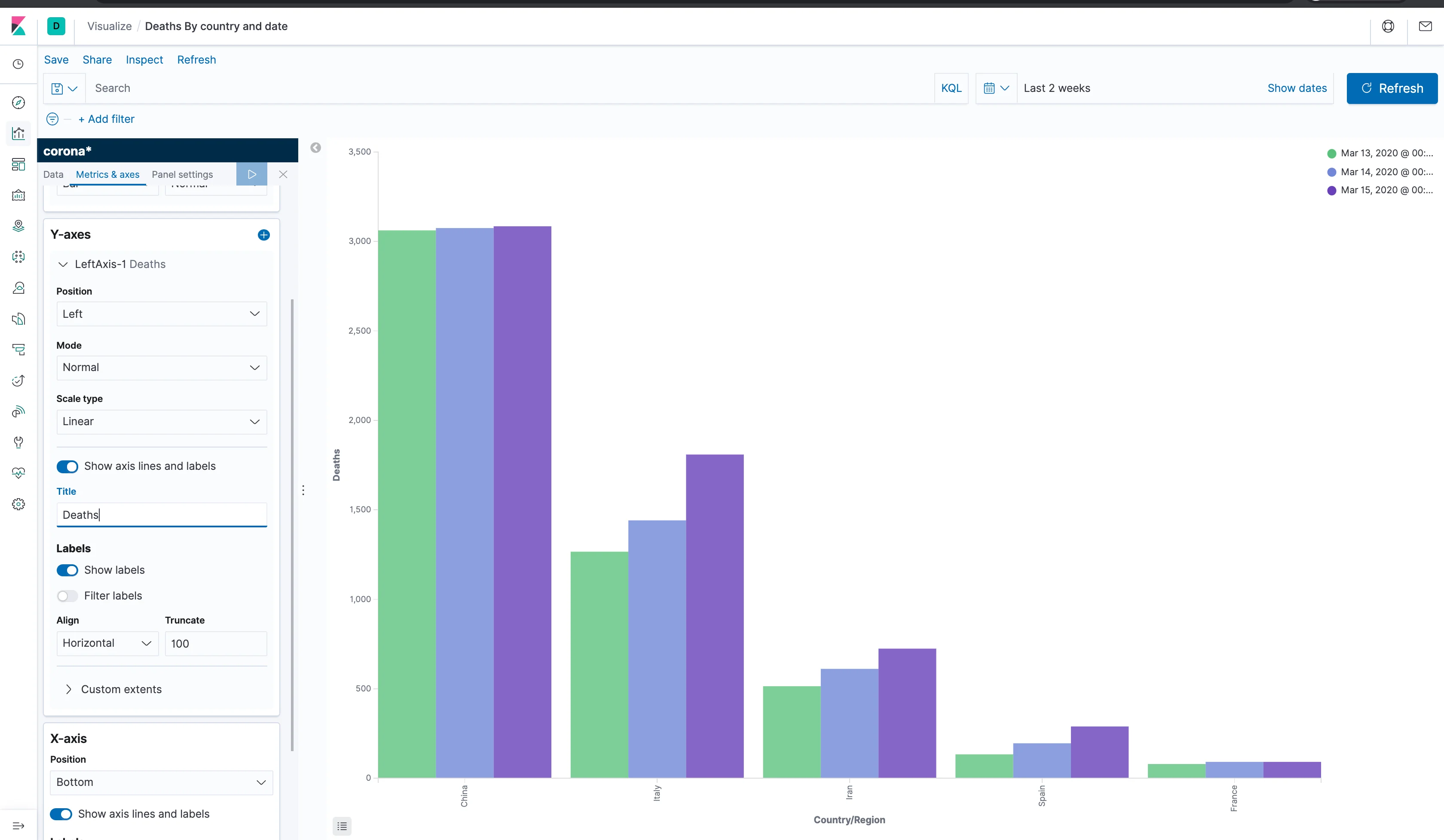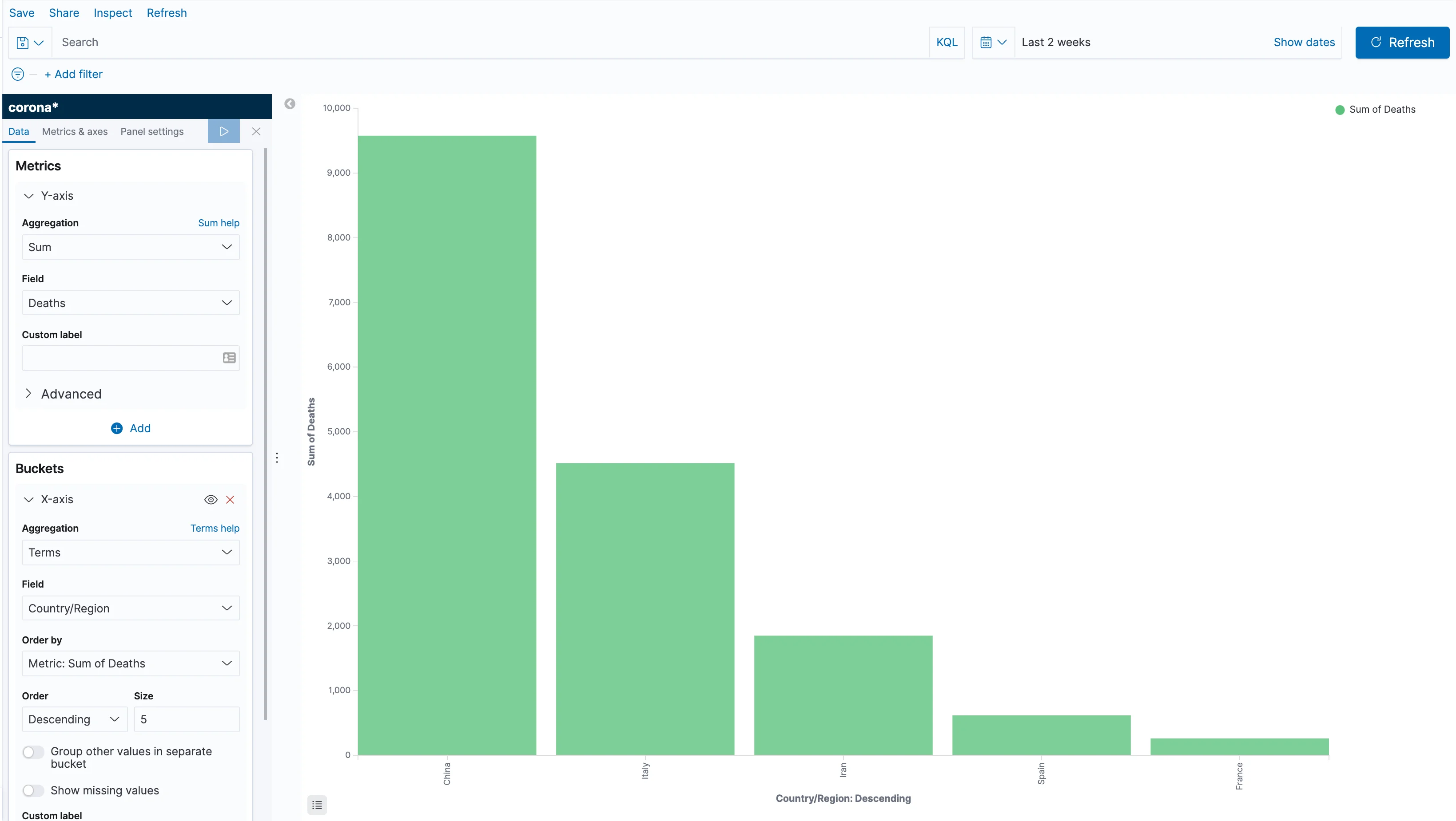 Click Add in the buckets section, and choose X-axis; then, select "Terms" as aggregation, and "Country/Region" as the field. Behind the scenes, what we're telling Elasticsearch is to split the data by country and then calculate the sum of deaths for each country. Apply the changes and you can now see a bar for each country. However, since we've explored the data a bit, we know that each bar contains the sum for all of the days we've loaded. Let's fix that, shall we?