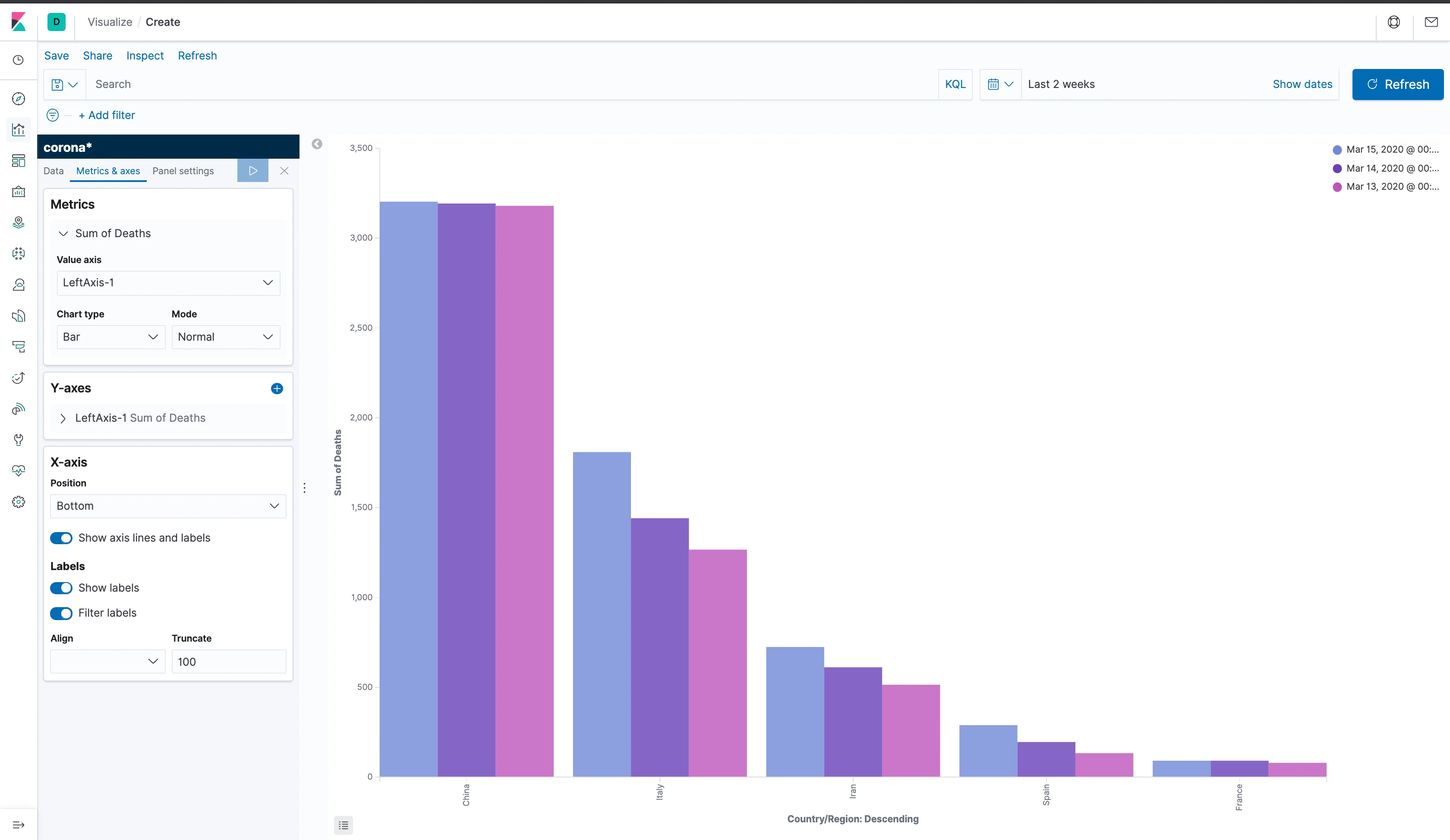 Now, that's more like it! We can now clearly see the differences between the data from different days for different countries. What's still unconventional, is the order of the columns: they're currently being sorted by a descending sum of deaths. While that's an optimistic way to spin the data, what we really want is to sort it by date, in an ascending order. To do that, go back to the data tab on the left and order the split series by a custom metric, which will be a maximum of the timestamp field, and choose to sort it in an ascending order.