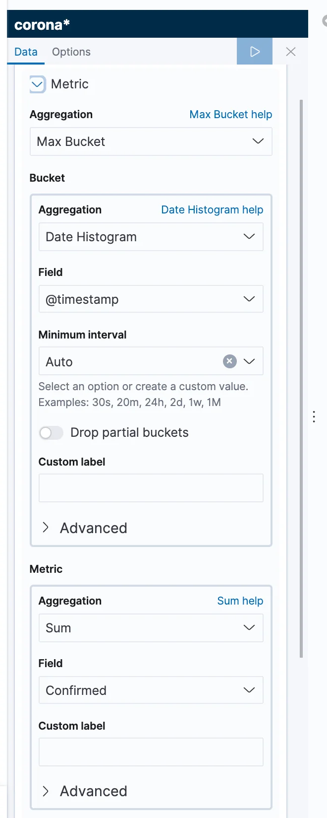 As per the usual, you can immediately see a total count of the documents based on the filter (remember? Documents are the Elastic's equivalent of records). What we actually want, is a total number of confirmed cases from the latest timestamp value. Let's start by changing the metric to the sum of confirmed cases. You should be already comfortable with doing that, after your work on the bar chart. That, however, shows us the sum of cases from all of the dates. To go about getting the latest sum, we need to understand a bit about the way Elasticsearch aggregations work.