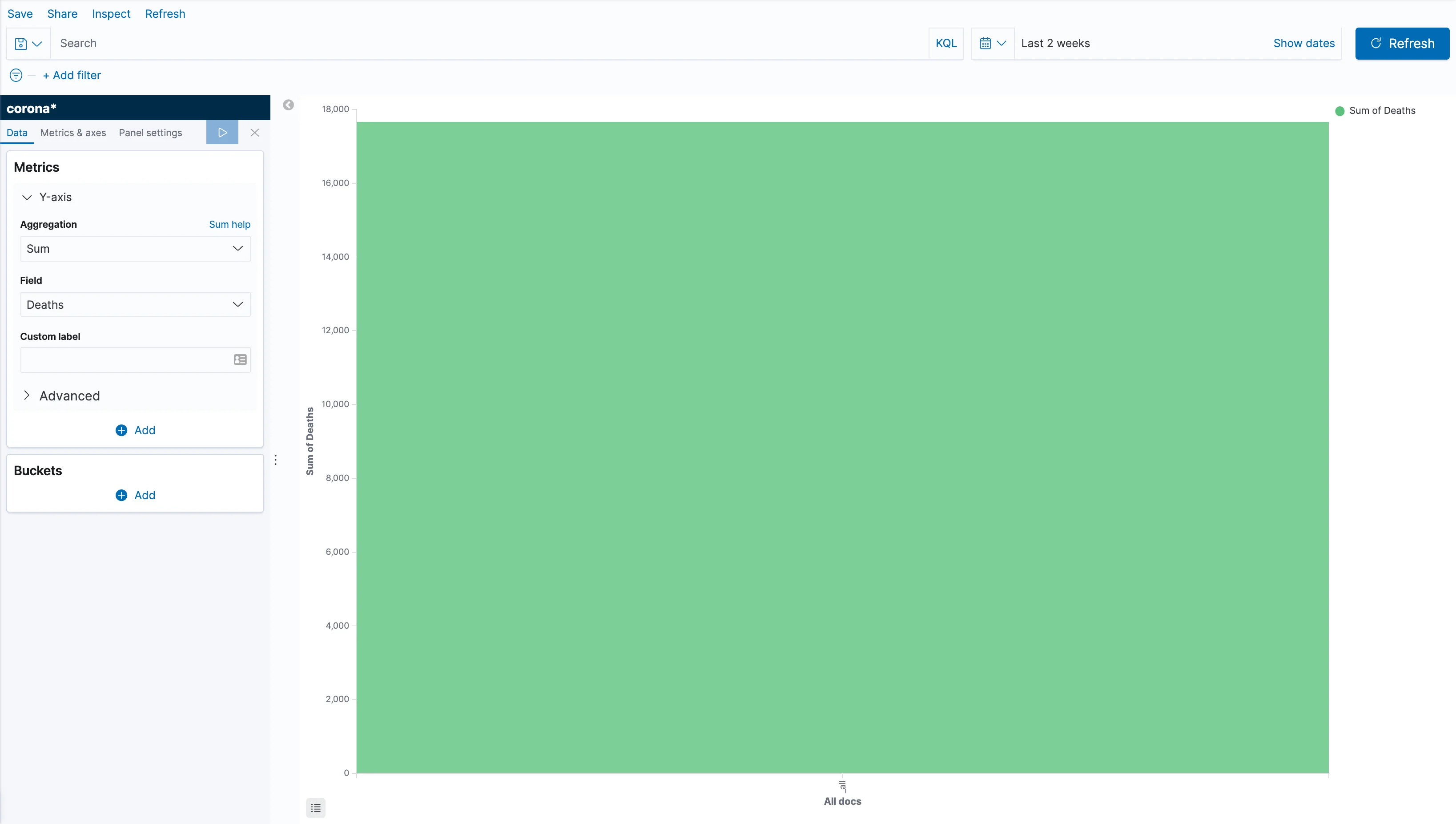 Now, we want to see deaths by country and date (hopefully, one day, less deaths by country and date). So let's first set the Y axis to show a total of deaths. Click the Y Axis and change the aggregation to Sum. Then choose Deaths in the field, and click the "Apply Changes" icon that looks like a play button. If you haven't been using Kibana for a while, it might be the case that nothing shows up, but that is probably due to a time filter that is too restrictive. Open the time filter at the top right of the screen and choose to show the the period that contains the data you've loaded, then click refresh.